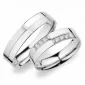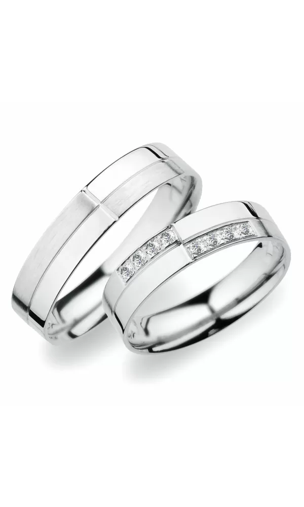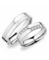 Snubné prstene vyrobené z bieleho štrnásťkarátového zlata 585/1000 rovného profilu s vnútorným fit profilom - zaoblenie vnútornej strany pre príjemnejšie nosenie s kombinovanou povrchovou úpravou lesk - zamatový mat, ktorý je oddelený jemnou ryhou. V dámskom prsteni je vsadených osem okrúhlych zirkónov s briliantovým brusom Signity star, ktorý dodáva zirkónom oslnivú brilanciu. Do snubných prsteňov si môžete nechať staviť aj diamanty. Kamene sú vsadené do zrniek. Vsadzovanie zirkónov i diamantov vykonávajú naši najskúsenejší majstri zlatníci ručne pod mikroskopom s presnosťou na 0,01mm a preto nehrozí vypadnutie kamienkov ako to býva u strojne vyrábaných snubných prsteňov. Ďalej je možné snubné prstene urobiť užšie - nižšia cena alebo širšie - vyššia cena.