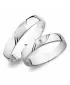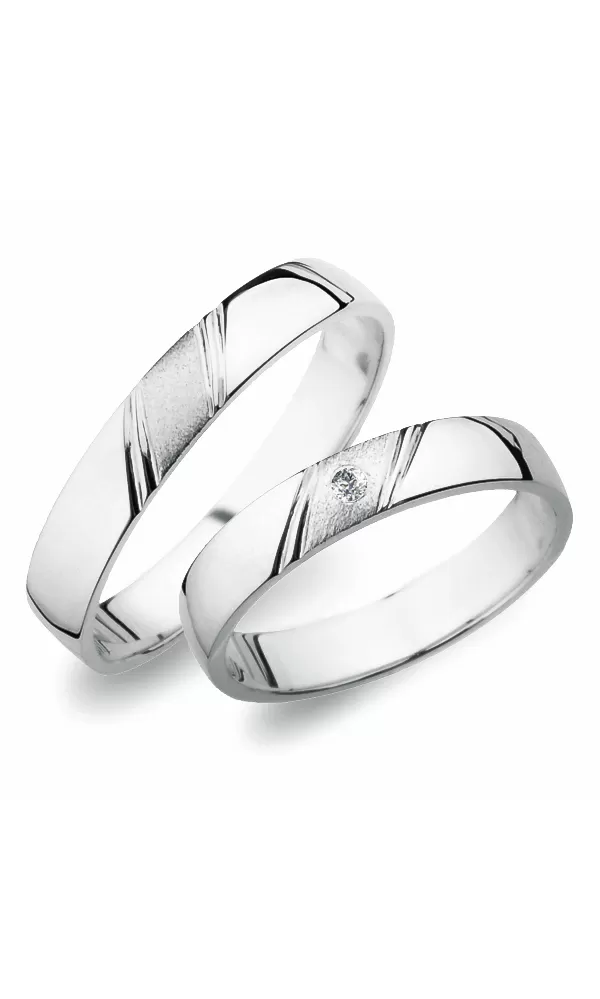 Snubné prstene vyrobené z bieleho štrnásťkarátového zlata 585/1000 polguľatého profilu. Na každom prsteni sú štyri ryhy a medzi nimi je diamantový mat. V dámskom prsteni je vsadený jeden okrúhly zirkón s briliantovým brusom Signity star, ktorý dodáva zirkónu oslnivú brilanciu. Do snubných prsteňov si môžete nechať staviť aj diamant. Kameň je vsadený do prsteňa "na hladko". Vsadzovanie zirkónov aj diamantov vykonávajú naši najskúsenejší majstri zlatníci ručne pod mikroskopom s presnosťou na 0,01 mm a preto nehrozí vypadnutie kamienkov ako to býva u strojne vyrábaných snubných prsteňov. Snubné prstene je možné vyrobiť v rôznych farebných kombináciách zlata. Ďalej je možné snubné prstene urobiť užšie - nižšia cena alebo širšie - vyššia cena.