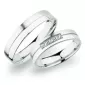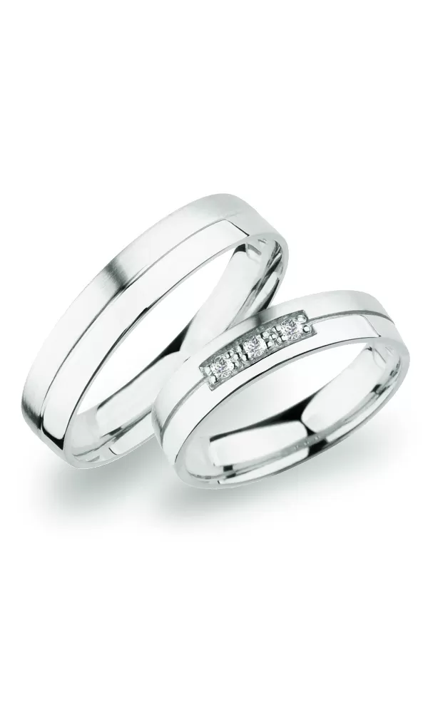 Snubné prstene rovného profilu vyrobené z bieleho štrnásťkarátového zlata 585/1000 v kombinovanej povrchovej úprave lesk - zamatový mat, ktorý od seba oddeľuje ryha po celom obvode snubných prsteňov. Snubné prstene majú vnútorné Fit Profil - polguľatú vnútornú stranu pre príjemnejšie nosenie. V dámskom prsteni sú vsadené tri okrúhle zirkóny s briliantovým brusom Signity star, ktorý dodáva zirkónom oslnivú brilanciu. Do snubných prsteňov si môžete nechať staviť aj diamanty. Kamene sú vsadené do prsteňa "na hladko". Vsadzovanie zirkónov aj diamantov vykonávajú naši najskúsenejší majstri zlatníci ručne pod mikroskopom s presnosťou na 0,01mm a preto nehrozí vypadnutie kamienkov ako to býva u strojne vyrábaných snubných prsteňov.