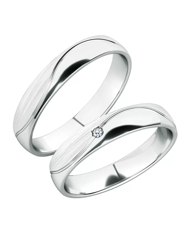 Snubné prstene sú vyrobené z bieleho štrnásťkarátového zlata 585/1000 v mierne polguľatom profile majú kombinovanou povrchovou úpravou lesk - zamatový mat s ryhou - vlnovkou, ktorá je vo vnútri matná. V dámskom prsteni je vsadený jeden okrúhly zirkón s briliantovým brusom Signity star, ktorý dodáva zirkónu maximálnu brilanciu. Do snubných prsteňov si môžete nechať staviť aj diamant vybrúsený briliantovým brusom. Diamanty oplývajú svojou krásou a vlastnosťami, ktoré sú oproti iným kameňom bezkonkurenčné. Je to najtvrdší nerast, ktorý nikdy nestratí svoju hodnotu. Diamant je kráľ všetkých drahokamov a teda aj jedným z najcennejších a preto sa oplatí do šperkov s diamantmi investovať a predovšetkým pri snubných prsteňoch, ktoré sú na celý život! Vsadzovanie zirkónov aj diamantov vykonávajú naši najskúsenejší majstri zlatníci ručne pod mikroskopom s presnosťou na 0,01 mm a preto nehrozí vypadnutie kamienkov ako to býva u strojne vyrábaných snubných prsteňov. Vďaka skladbe a štýlovo čistému vsadeniu kameňov, prsteň vyniká krásnou brilanciou kameňov! Snubné prstene majú vnútorný fit profil - zaoblenie vnútornej strany prsteňov. Snubné prstene je možné upraviť podľa vašich prianí napr. rôzne šírky a povrchové úpravy.