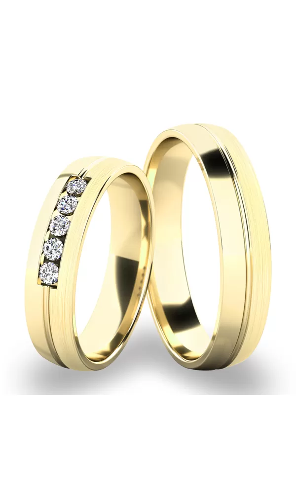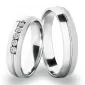 Veľmi obľúbený vzor snubných prsteňov pologuľatého profilu vyrobených z bieleho štrnásťkarátového zlata 585/1000 s kombinovanou povrchovou úpravou lesk - zamatový mat a s lesklou ryhou. V dámskom prsteni je vsadených päť okrúhlych zirkónov popr. diamantov briliantového brusu. Snubné prstene majú vnútorné Fit Profil - polguľatú vnútornú stranu pre príjemnejšie nosenie, nasadzovanie a odnímanie. Snubné prstene je možné vyrobiť v rôznych farebných kombináciách zlata as ľubovoľným počtom kameňov napr. so siedmimi alebo s kameňmi po celom obvode prsteňa. Ďalej je možné snubné prstene urobiť užšie - nižšia cena alebo širšie - vyššia cena.
