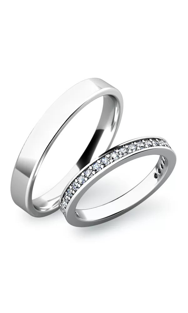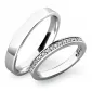 Užšie snubné prstene v rovnom profile vyrobené z bieleho štrnásťkarátového zlata 585/1000 v lesklej povrchovej úprave. Snubné prstene majú vnútorné Fit Profil - polguľatú vnútornú stranu pre príjemnejšie nosenie, nasadzovanie a odnímanie. V dámskom prsteni je vsadených 27 ks okrúhlych zirkónov s briliantovým brusom Signity star, ktorý dodáva zirkónom oslnivú brilanciu. Do snubných prsteňov si môžete nechať staviť aj diamanty. Kamene sú do prsteňa vsadené "do zrniek". Vsadzovanie zirkónov aj diamantov vykonávajú naši najskúsenejší majstri zlatníci ručne pod mikroskopom s presnosťou na 0,01 mm a preto nehrozí vypadnutie kamienkov ako to býva u strojne vyrábaných snubných prsteňov.