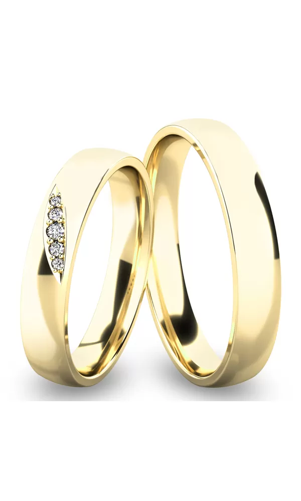 Snubné prstene v mierne polguľatom profile sú vyrobené z bieleho štrnásťkarátového zlata 585/1000 v lesklej povrchovej úprave v nadčasovom dizajne. Snubné prstene majú vnútorné Fit Profil - polguľatú vnútornú stranu pre príjemnejšie nosenie, nasadzovanie a odnímanie. V dámskom prsteni je vsadených päť okrúhlych zirkónov s briliantovým brusom Signity star, ktorý dodáva zirkónom oslnivú brilanciu. Do snubných prsteňov si môžete nechať staviť aj diamanty. Kamene sú vsadené "do zrniek". Vsadzovanie zirkónov aj diamantov vykonávajú naši najskúsenejší majstri zlatníci ručne pod mikroskopom a preto nehrozí vypadnutie kamienkov ako to býva u strojne vyrábaných snubných prsteňov.