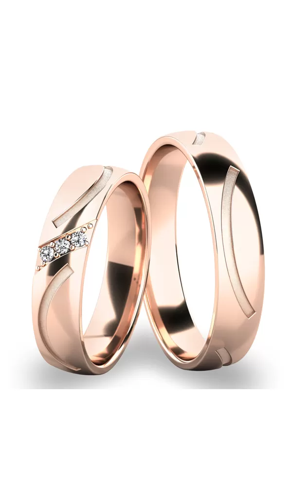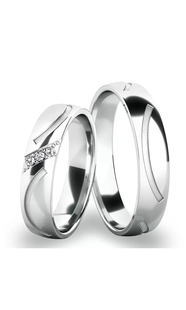 Moderné snubné prstene mierne polguľatého profilu vyrobené z bieleho štrnásťkarátového zlata 585/1000 v kombinovanej povrchovej úprave lesk/pieskovanie, kedy do lesklých prsteňov sú zapustené - vyfrézované drážky, ktoré sú pieskované. Snubné prstene majú vnútorné Fit Profil - polguľatú vnútornú stranu pre príjemnejšie nosenie, nasadzovanie a odnímanie. V dámskom prsteni sú vsadené 3 ks okrúhlych zirkónov s briliantovým brusom Signity star, ktorý zaručuje zirkónom oslnivú brilanciu. Do snubných prsteňov si môžete nechať staviť aj diamanty. Kamene sú do prsteňa vsadené "do krapničiek". Vsadzovanie zirkónov aj diamantov vykonávajú naši najskúsenejší majstri zlatníci ručne pod mikroskopom s presnosťou na 0,01 mm a preto nehrozí vypadnutie kamienkov ako to býva u strojne vyrábaných snubných prsteňov.