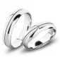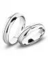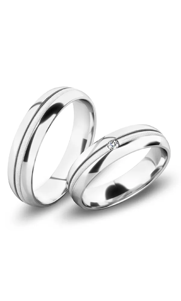 Moderné snubné prstene polguľatého profilu vyrobené z bieleho štrnásťkarátového zlata 585/1000 v kombinovanej povrchovej úprave lesk/pieskovanie, kedy prostredný polguľatý zapustený prúžok je pieskovaný a okraje lesklé. Snubné prstene majú vnútorné Fit Profil - polguľatú vnútornú stranu pre príjemnejšie nosenie, nasadzovanie a odnímanie. V dámskom prsteni je vsadený 1 ks okrúhleho zirkónu s briliantovým brusom Signity star, ktorý zaručuje zirkónu oslnivú brilanciu. Do snubných prsteňov si môžete nechať staviť aj diamant. Kamene sú do prsteňa vsadené "na hladko". Vsadzovanie zirkónov aj diamantov vykonávajú naši najskúsenejší majstri zlatníci ručne pod mikroskopom s presnosťou na 0,01 mm a preto nehrozí vypadnutie kamienkov ako to býva u strojne vyrábaných snubných prsteňov.