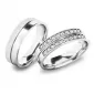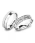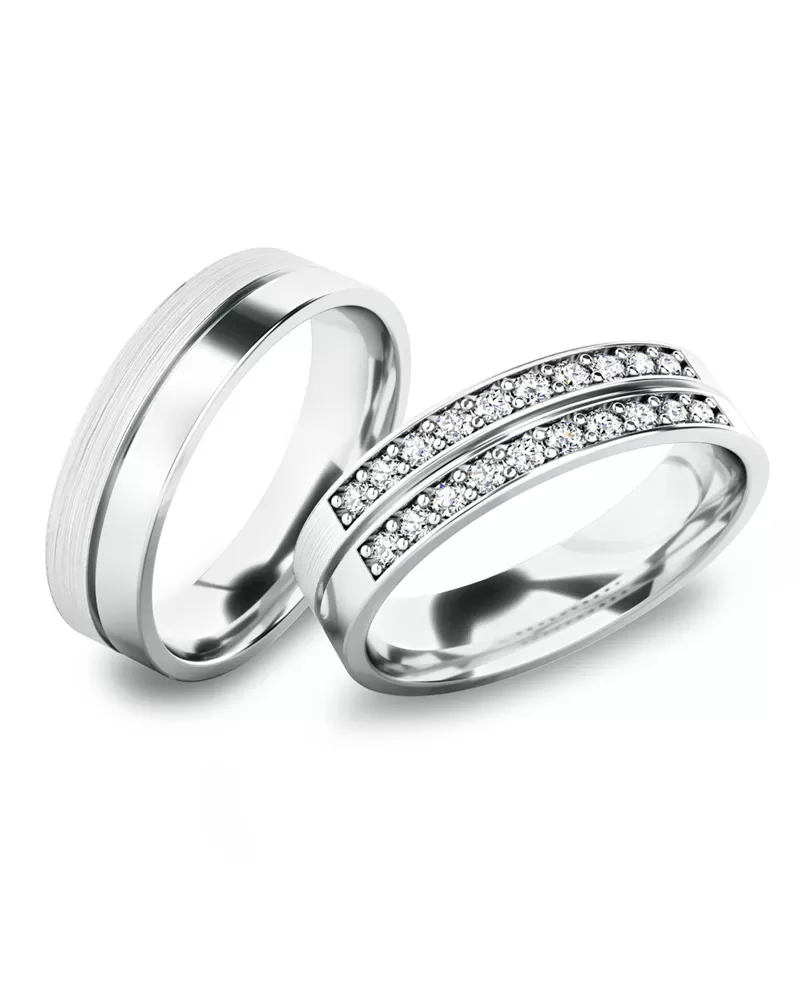 Luxusné snubné prstene v rovnom profile vyrobené z bieleho štrnásťkarátového zlata 585/1000 v lesklej povrchovej úprave. Snubné prstene majú vnútorné Fit Profil - polguľatú vnútornú stranu pre príjemnejšie nosenie, nasadzovanie a odnímanie. V dámskom prsteni je vsadených 20 ks okrúhlych zirkónov s briliantovým brusom Signity star, ktorý zaručuje zirkónom oslnivú brilanciu. Do snubných prsteňov si môžete nechať staviť aj diamanty. Kamene sú do prsteňa vsadené "do krapničiek". Vsadzovanie zirkónov aj diamantov vykonávajú naši najskúsenejší majstri zlatníci ručne pod mikroskopom s presnosťou na 0,01 mm a preto nehrozí vypadnutie kamienkov ako to býva u strojne vyrábaných snubných prsteňov.