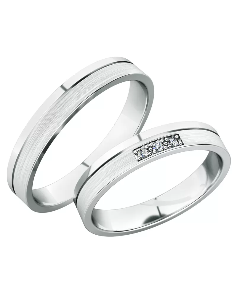 Elegantné užšie snubné prstene v rovnom profile vyrobené z bieleho štrnásťkarátového zlata 585/1000 v kombinovanej povrchovej úprave lesk - zamatový mat. Snubné prstene majú vnútorné Fit Profil - polguľatú vnútornú stranu pre príjemnejšie nosenie, nasadzovanie a odnímanie. V dámskom prsteni sú vsadené 3 ks okrúhlych zirkónov s briliantovým brusom Signity star, ktorý zaručuje zirkónom oslnivú brilanciu. Do snubných prsteňov si môžete nechať staviť aj diamanty. Kamene sú do prsteňa vsadené "do krapničiek". Vsadzovanie zirkónov aj diamantov vykonávajú naši najskúsenejší majstri zlatníci ručne pod mikroskopom s presnosťou na 0,01 mm a preto nehrozí vypadnutie kamienkov ako to býva u strojne vyrábaných snubných prsteňov.