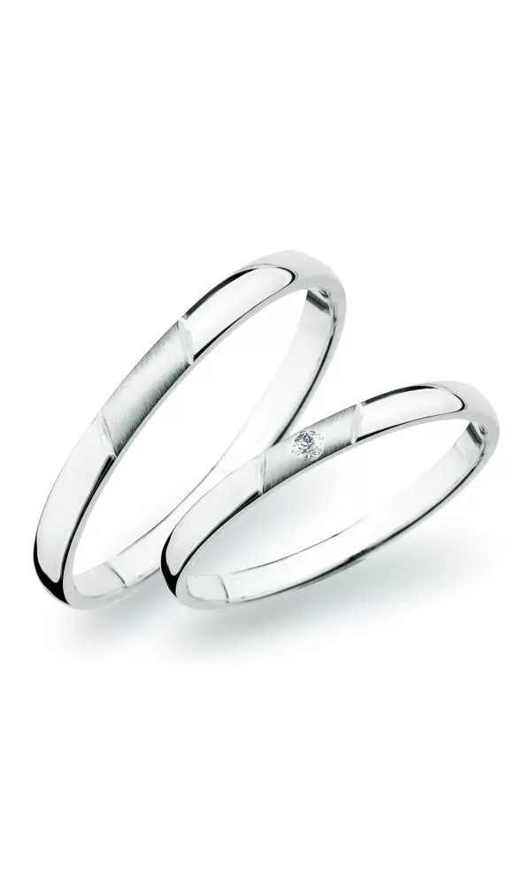 Obľúbený vzor snubných prsteňov polguľatého profilu vyrobených z bieleho štrnásťkarátového zlata 585/1000 s vnútorným fit profilom - zaoblenie vnútornej strany pre príjemnejšie nosenie s kombinovanou povrchovou úpravou lesk - zamatový mat, ktorý je oddelený ryhami. V dámskom prsteni je vsadený jeden okrúhly zirkón s briliantovým brusom Signity star, ktorý dodáva zirkónu oslnivú brilanciu. Do snubných prsteňov si môžete nechať staviť aj diamant. Kameň je vsadený do prsteňa "na hladko". Vsadzovanie zirkónov aj diamantov vykonávajú naši najskúsenejší majstri zlatníci ručne pod mikroskopom s presnosťou na 0,01 mm a preto nehrozí vypadnutie kamienkov ako to býva u strojne vyrábaných snubných prsteňov. Snubné prstene je možné vyrobiť v rôznych farebných kombináciách zlata. Ďalej je možné snubné prstene urobiť napr. užšia - nižšia cena alebo širšia - vyššia cena.