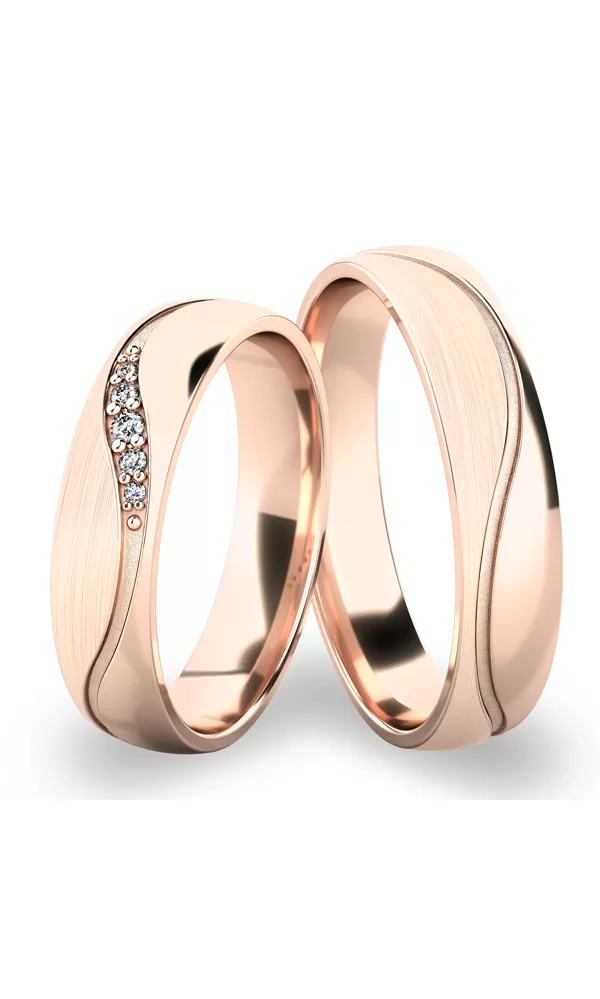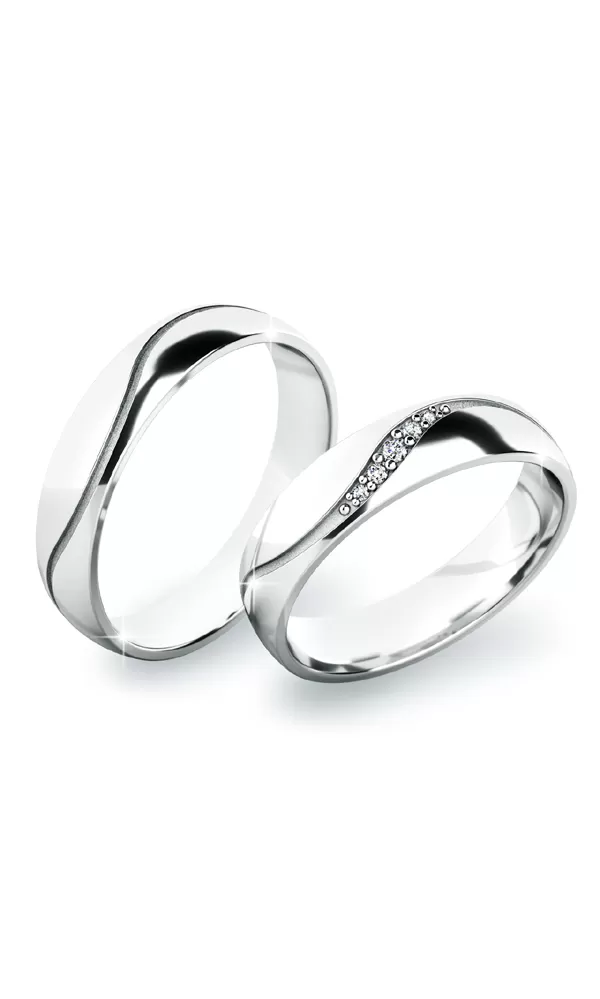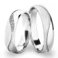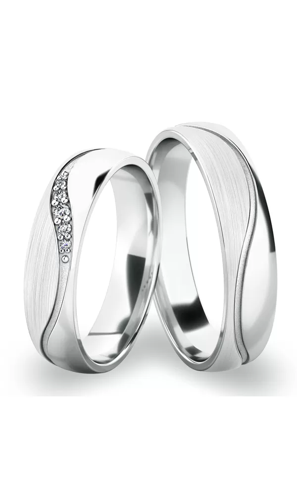 Elegantné snubné prstene mierne polguľatého profilu sú vyrobené z bieleho štrnásťkarátového zlata 585/1000 v kombinovanej povrchovej úprave lesk x mat s matnou vlnovkou. Snubné prstene majú vnútorné Fit Profil - polguľatú vnútornú stranu pre príjemnejšie nosenie, nasadzovanie a odnímanie. V dámskom prsteni je vsadených 5ks okrúhlych zirkónov s briliantovým brusom Signity star, ktorý dodáva zirkónom oslnivú brilanciu. Do snubných prsteňov si môžete nechať staviť aj diamanty. Kamene sú do prsteňa vsadené "do zrniek". Vsadzovanie zirkónov aj diamantov vykonávajú naši najskúsenejší majstri zlatníci ručne pod mikroskopom s presnosťou na 0,01 mm a preto nehrozí vypadnutie kamienkov ako to býva u strojne vyrábaných snubných prsteňov.
