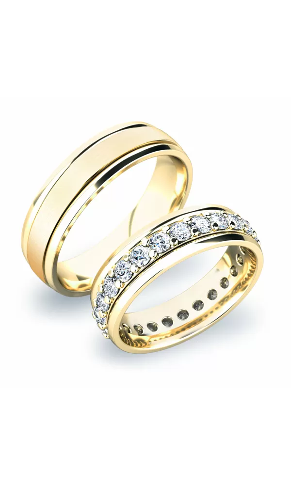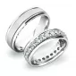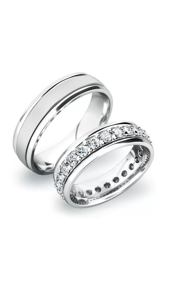 Luxusné snubné prstene v mierne polguľatom profile sú vyrobené z bieleho štrnásťkarátového zlata 585/1000 v kombinovanej povrchovej úprave lesk-mat. Snubné prstene majú vnútorné Fit Profil - polguľatú vnútornú stranu pre príjemnejšie nosenie, nasadzovanie a odnímanie. V dámskom prsteni sú vsadené po celom obvode zirkóny s briliantovým brusom Signity star, ktorý dodáva zirkónom oslnivú brilanciu. Do snubných prsteňov si môžete nechať staviť aj diamanty. Kamene sú do prsteňa vsadené "do krapničiek". Vsadzovanie zirkónov aj diamantov vykonávajú naši najskúsenejší majstri zlatníci ručne pod mikroskopom s presnosťou na 0,01 mm a preto nehrozí vypadnutie kamienkov ako to býva u strojne vyrábaných snubných prsteňov.