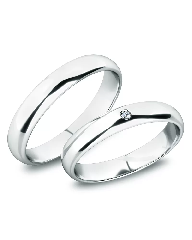 Obľúbené snubné prstene polguľatého profilu vyrobené z bieleho štrnásťkarátového zlata 585/1000 v lesklej povrchovej úprave. V dámskom prsteni je… Celý popis