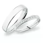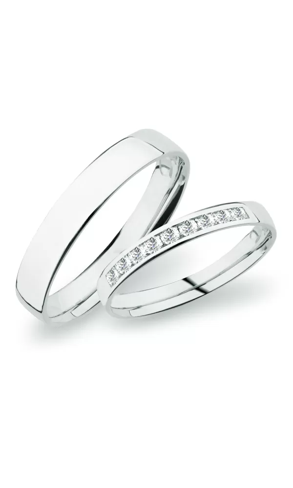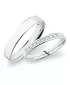 Užšie snubné prstene mierne polguľatého profilu vyrobené z bieleho štrnásťkarátového zlata 585/1000 v lesklej povrchovej úprave. Snubné prstene majú vnútorné Fit Profil - polguľatú vnútornú stranu pre príjemnejšie nosenie, nasadzovanie a odnímanie. V dámskom prsteni je vsadených deväť okrúhlych zirkónov popr. diamantov briliantového brúsu.
