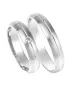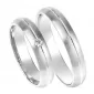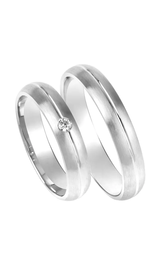 Zlaté snubné prstene z bieleho štrnásťkarátového zlata 585/1000 polguľatého profilu s matnou povrchovou úpravou a lesklou ryhou s jedným okrúhlym zirkónom poprípade diamantom briliantového brusu v dámskom prsteni. Snubné prstene je možné vyrobiť v kombinovanej povrchovej úprave lesk - mat alebo celé lesklé. Tiež sú možné kombinácie žltého a bieleho popr. červeného zlata.
