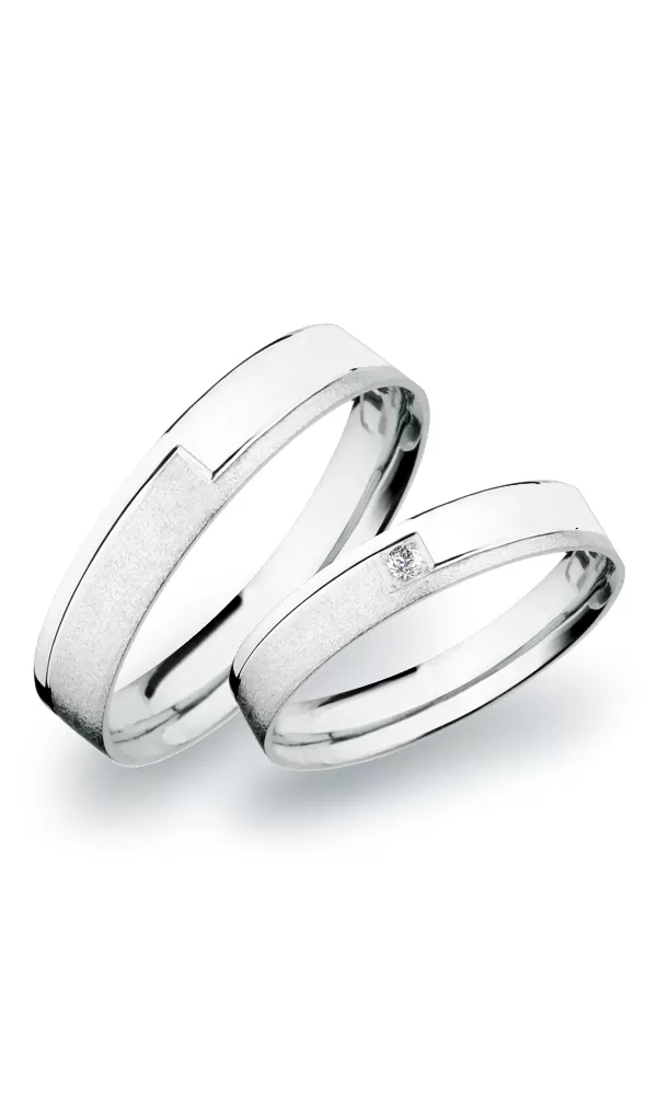 Snubné prstene rovného profilu vyrobené z bieleho štrnásťkarátového zlata 585/1000 v kombinovanej povrchovej úprave lesk - diamantový mat. Snubné… Celý popis