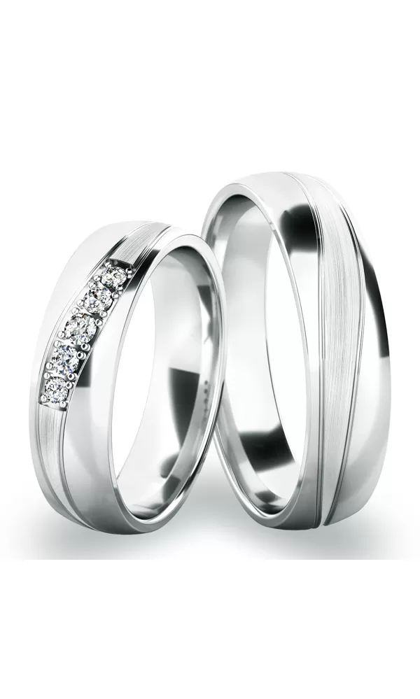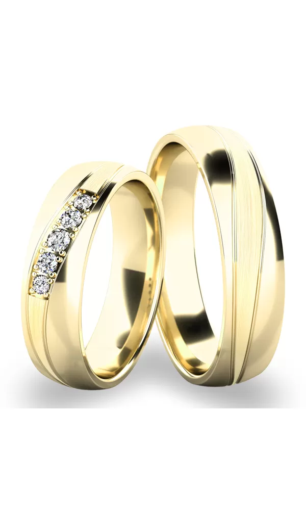 Snubné prstene vyrobené zo štrnásťkarátového zlata 585/1000 v mierne polguľatom profile. Po celom obvode sú matné ryhy - vlnovky, ktoré vytvárajú "esíčka", ktoré sú vo vnútri matné a kraje sú lesklé. V dámskom prsteni je vsadených päť okrúhlych zirkónov popr. diamantov briliantového brusu. Snubné prstene majú vnútorný fit profil - zaoblenie vnútornej strany prsteňov. Snubné prstene je možné upraviť podľa vašich prianí! Je možné meniť šírku ako dámskeho tak pánskeho prsteňa, je možné vsadiť do prsteňov ľubovoľný počet kameňov, kombinovať povrchové úpravy atď.