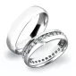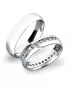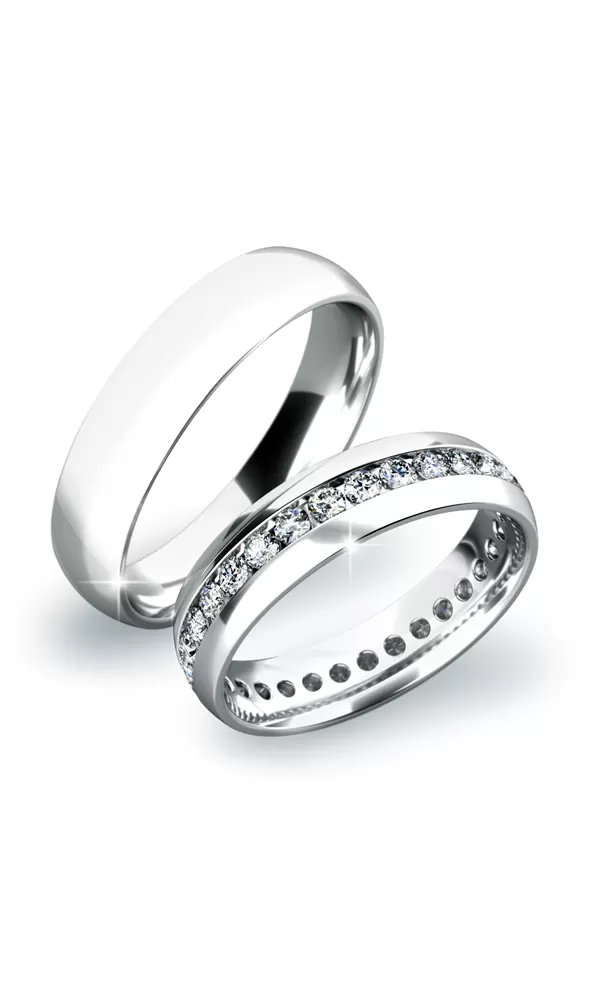 Nádherné snubné prstene mierne polguľatého profilu vyrobené z bieleho štrnásťkarátového zlata 585/1000 v lesklej povrchovej úprave. Snubné prstene majú vnútorné Fit Profil - polguľatú vnútornú stranu pre príjemnejšie nosenie, nasadzovanie a odnímanie. V dámskom prsteni je vsadené po celom obvode 31 (podľa veľkosti prsteňa) okrúhlych zirkónov s briliantovým brusom Signity star, ktorý dodáva zirkónom oslnivú brilanciu. Do snubných prsteňov si môžete nechať staviť aj diamanty. Kamene sú do prsteňa vsadené "na hladko". Vsadzovanie zirkónov aj diamantov vykonávajú naši najskúsenejší majstri zlatníci ručne pod mikroskopom s presnosťou na 0,01 mm a preto nehrozí vypadnutie kamienkov ako to býva u strojne vyrábaných snubných prsteňov.