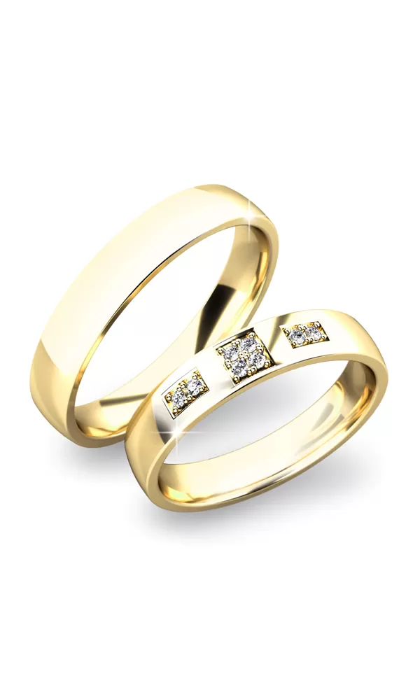 Luxusné snubné prstene v mierne polguľatom profile sú vyrobené z bieleho štrnásťkarátového zlata 585/1000 v lesklej povrchovej úprave. Snubné prstene majú vnútorné Fit Profil - polguľatú vnútornú stranu pre príjemnejšie nosenie, nasadzovanie a odnímanie. V dámskom prsteni je vsadených osem okrúhlych zirkónov s briliantovým brusom Signity star, ktorý dodáva zirkónom oslnivú brilanciu. Do snubných prsteňov si môžete nechať staviť aj diamanty. Kamene sú do prsteňa vsadené "do zrniek". Vsadzovanie zirkónov aj diamantov vykonávajú naši najskúsenejší majstri zlatníci ručne pod mikroskopom s presnosťou na 0,01 mm a preto nehrozí vypadnutie kamienkov ako to býva u strojne vyrábaných snubných prsteňov.