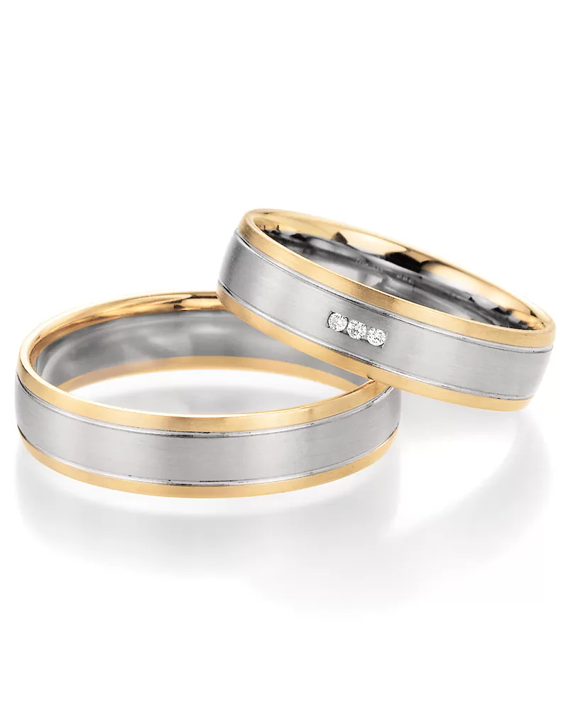 Dvojfarebné snubné prstene s diamantmi z bieleho a žltého zlata 585/1000 - štrnásť karátov vo veľmi miernom polguľatom profile v povrchovej úprave zamatový mat. Stredný pásik z bieleho zlata je oddelený od krajov zo žltého zlata jemnými ryhami. V dámskom prsteni sú vsadené tri okrúhle diamanty briliantového brusu. Diamanty oplývajú svojou krásou a vlastnosťami, ktoré sú oproti iným kameňom bezkonkurenčné. Je to najtvrdší nerast, ktorý nikdy nestratí svoju hodnotu. Diamant je kráľ všetkých drahokamov a teda aj jedným z najcennejších a preto sa oplatí do šperkov s diamantmi investovať a predovšetkým pri snubných prsteňoch, ktoré sú na celý život!  Vsadzovanie diamantov vykonávajú naši najskúsenejší majstri zlatníci ručne pod mikroskopom s presnosťou na 0,01 mm a preto nehrozí vypadnutie kamienkov ako to býva u strojne vyrábaných snubných prsteňov. Snubné prstene majú vnútorný fit profil - zaoblenie vnútornej strany prsteňov.