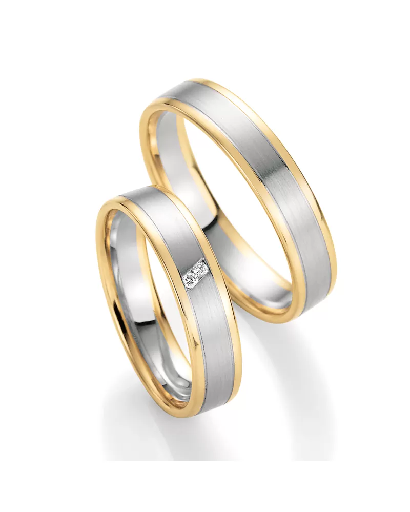 Kombinované snubné prstene z bieleho a žltého zlata 585/1000 - štrnásť karátov vo veľmi miernom polguľatom profile v povrchovej úprave zamatový mat na strednej časti -kraje lesklé sú oddelené jemnými ryhami. vsadené dve okrúhle diamanty briliantového brusu. Diamanty oplývajú svojou krásou a vlastnosťami, ktoré sú oproti iným kameňom bezkonkurenčné. Je to najtvrdší nerast, ktorý nikdy nestratí svoju hodnotu. diamanty investovať a predovšetkým u snubných prsteňov, ktoré sú na celý život! Vsadzovanie diamantov vykonávajú naši najskúsenejší majstri zlatníci ručne pod mikroskopom s presnosťou na 0,01 mm a preto nehrozí vypadnutie kamienkov ako to býva u strojne vyrábaných snubných prsteňov. Snubné prstene majú vnútorný fit profil -