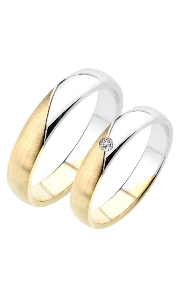 Kombinované snubné prstene zo žltého a bieleho štrnástikarátového zlata 585/1000 polguľatého profilu s kombinovanou povrchovou úpravou lesk - zamatový mat, ktorý je oddelený lesklou ryhou. V dámskom prsteni je vsadený jeden okrúhly zirkón popr. diamant briliantového brusu. Prstene je samozrejme možné vyrobiť iba zo žltého alebo bieleho zlata.