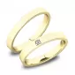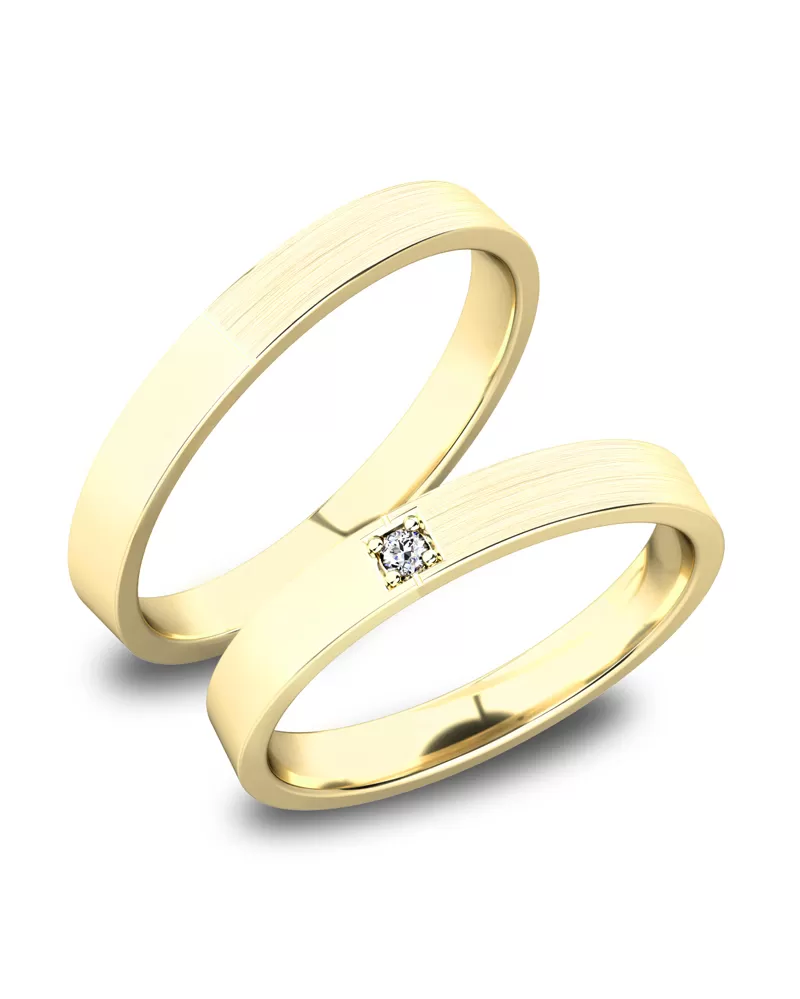 Snubné prstene rovného profilu vyrobené zo žltého štrnásťkarátového zlata 585/1000 v kombinovanej povrchovej úprave lesk - zamatový mat. Snubné prstene majú vnútorné Fit Profil - polguľatú vnútornú stranu pre príjemnejšie nosenie. V dámskom prsteni je vsadený do štvorčeka jeden okrúhly zirkón s briliantovým brusom Signity star, ktorý dodáva zirkónu maximálnu brilanciu. Do snubných prsteňov si môžete nechať staviť aj diamant vybrúsený briliantovým brusom. Diamanty oplývajú svojou krásou a vlastnosťami, ktoré sú oproti iným kameňom bezkonkurenčné. Je to najtvrdší nerast, ktorý nikdy nestratí svoju hodnotu. Diamant je kráľ všetkých drahokamov a teda aj jedným z najcennejších a preto sa oplatí do šperkov s diamantmi investovať a predovšetkým pri snubných prsteňoch, ktoré sú na celý život! Kameň je vsadený do prsteňa "do zrniek". Vsadzovanie zirkónov aj diamantov vykonávajú naši najskúsenejší majstri zlatníci ručne pod mikroskopom s presnosťou na 0,01 mm a preto nehrozí vypadnutie kamienkov ako to býva u strojne vyrábaných snubných prsteňov. Snubné prstene je možné vyrobiť v ľubovoľných úpravách napr. s viacerými kameňmi alebo vyrobiť snubné prstene užšie - nižšia cena alebo širšie - vyššia cena.