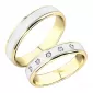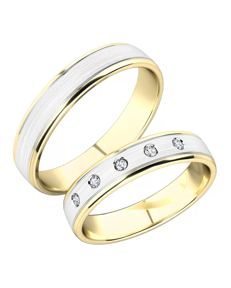Snubné prstene sú vyrobené z bieleho a žltého štrnásťkarátového zlata 585/1000 mierne polguľatého profilu s vnútorným fit profilom - zaoblenie vnútornej strany pre príjemnejšie nosenie s kombinovanou povrchovou úpravou lesk - zamatový mat, ktorý je oddelený jemnými ryhami. V dámskom prsteni je vsadených päť okrúhlych zirkónov s briliantovým brusom Signity star, ktorý dodáva zirkónom oslnivú brilanciu. Do snubných prsteňov si môžete nechať staviť aj diamanty. Kamene sú do prsteňa vsadené "na hladko". Vsadzovanie zirkónov aj diamantov vykonávajú naši najskúsenejší majstri zlatníci ručne pod mikroskopom s presnosťou na 0,01 mm a preto nehrozí vypadnutie kamienkov ako to býva u strojne vyrábaných snubných prsteňov. Snubné prstene je možné vyrobiť v rôznych farebných kombináciách zlata as ľubovoľným počtom kameňov. Ďalej je možné snubné prstene urobiť užšie - nižšia cena alebo širšie - vyššia cena.