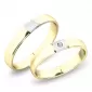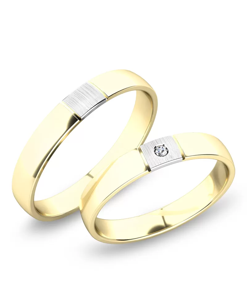Veľmi obľúbený vzor snubných prsteňov polguľatého profilu vyrobených zo žltého štrnásťkarátového zlata 585/1000 s vnútorným fit profilom - zaoblenie vnútornej strany pre príjemnejšie nosenie s kombinovanou povrchovou úpravou lesk - diamantový mat, ktorý je oddelený ryhami. V dámskom prsteni je vsadený jeden okrúhly zirkón popr. diamant briliantového brusu. Snubné prstene je možné vyrobiť v rôznych farebných kombináciách zlata. Ďalej je možné snubné prstene urobiť užšie - nižšia cena alebo širšie - vyššia cena.