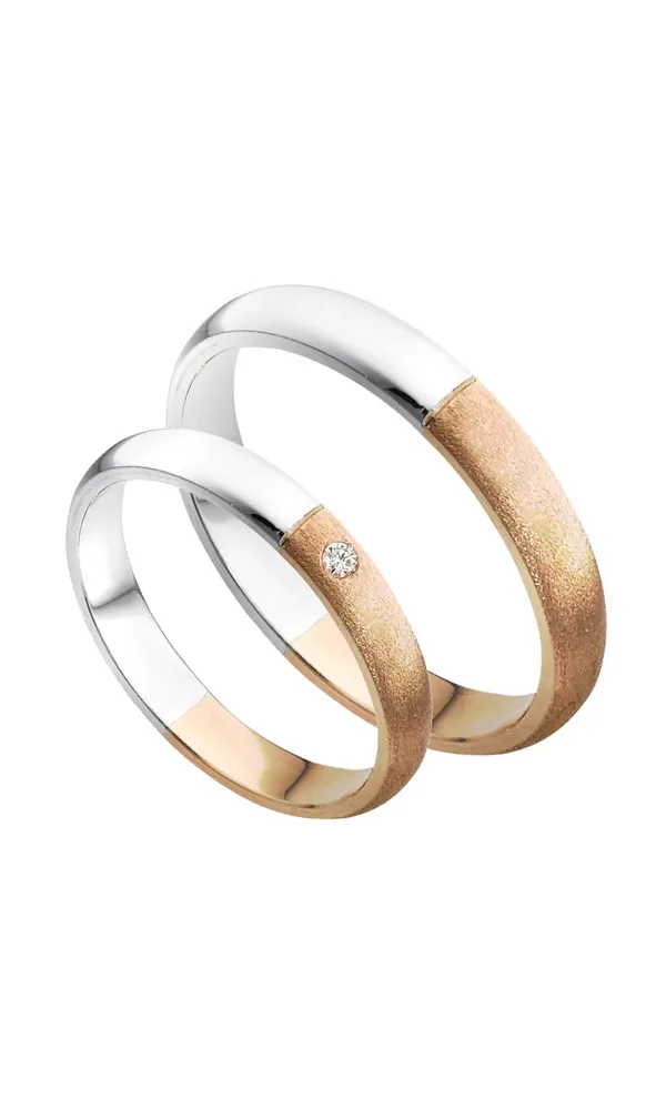 Snubné prstene z červeného a bieleho štrnásťtikarátového zlata 585/1000 polguľatého profilu s kombinovanou povrchovou úpravou lesk - brúsený mat as jedným okrúhlym zirkónom poprípade diamantom briliantového brusu vdá. Snubné prstene je možné tiež vyrobiť iba zo žltého alebo bieleho zlata alebo z ich kombinácie.