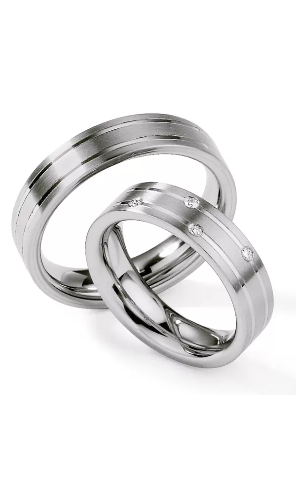 Moderné snubné prstene z chirurgickej ocele v rovnom profile s dvoma lesklými prúžkami zvýraznenými jemnými ryhami v zamatovom mate. V dámskom prsteni sú vsadené štyri okrúhle diamanty briliantového výbrusu. Diamanty vynikajú svojou krásou a vlastnosťami, ktoré sú oproti iným kameňom bezkonkurenčné. Je to najtvrdší nerast, ktorý nikdy nestratí svoju hodnotu. Diamant je kráľ všetkých drahokamov a teda aj jedným z najcennejších a preto sa oplatí do šperkov s diamantmi investovať a predovšetkým pri snubných prsteňoch, ktoré sú na celý život! Vsadzovanie diamantov vykonávajú naši najskúsenejší majstri zlatníci ručne pod mikroskopom s presnosťou na 0,01 mm a preto nehrozí vypadnutie kamienkov ako to býva u strojne vyrábaných snubných prsteňov. Snubné prstene majú vnútorný fit profil - zaoblenie vnútornej strany prsteňov pre príjemnejšie nosenie, nasadzovanie a odnímanie prsteňov.