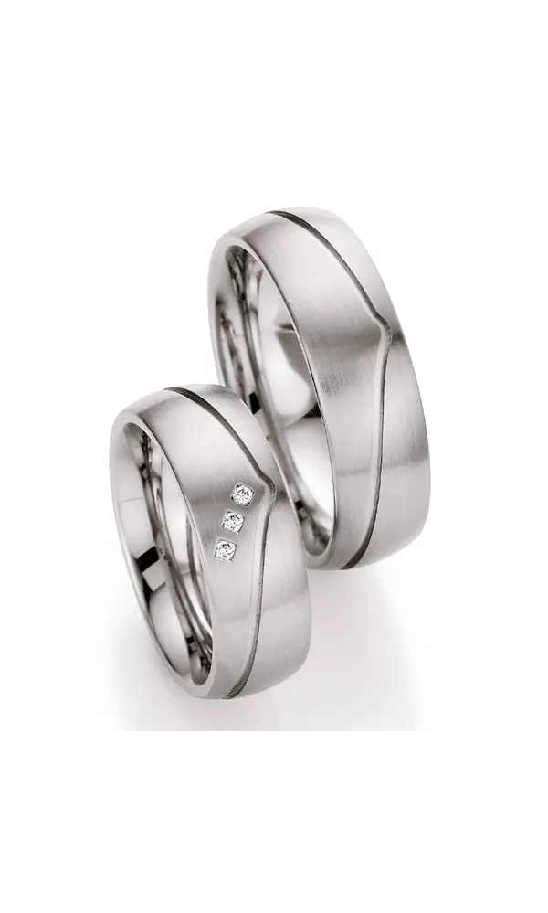 Široké snubné prstene z chirurgickej ocele polguľatého profilu s tromi okrúhlymi diamantmi briliantového brusu v dámskom prsteni. Diamanty vynikajú svojou krásou a vlastnosťami, ktoré sú oproti iným kameňom bezkonkurenčné. Je to najtvrdší nerast, ktorý nikdy nestratí svoju hodnotu. Diamant je kráľ všetkých drahokamov a teda aj jedným z najcennejších a preto sa oplatí do šperkov s diamantmi investovať a predovšetkým pri snubných prsteňoch, ktoré sú na celý život!  Vsadzovanie diamantov vykonávajú naši najskúsenejší majstri zlatníci ručne pod mikroskopom s presnosťou na 0,01 mm a preto nehrozí vypadnutie kamienkov ako to býva u strojne vyrábaných snubných prsteňov. Snubné prstene majú vnútorný fit profil - zaoblenie vnútornej strany prsteňov pre príjemnejšie nosenie, nasadzovanie a odnímanie prsteňov.