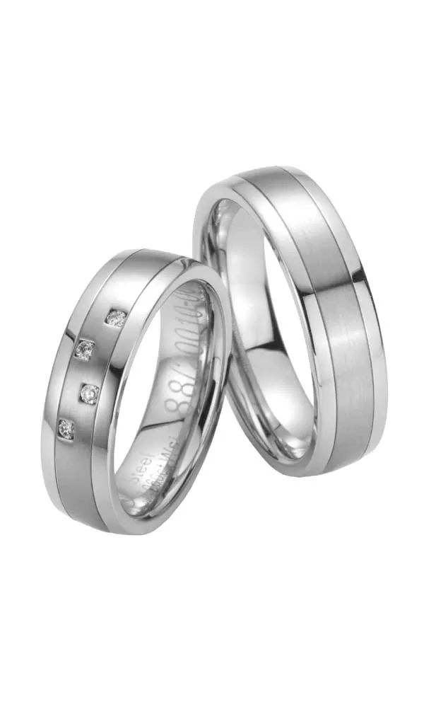 Oceľové snubné prstene so štyrmi okrúhlymi diamantmi briliantového brusu v dámskom prsteni v kombinovanej povrchovej úprave zamatový mat – lesk, kedy prostredný zamatovo matný prúžok je na snubných prsteňoch zvýraznený a ohraničený jemnými ryhami. Diamanty vynikajú svojou krásou a vlastnosťami, ktoré sú oproti iným kameňom bezkonkurenčné. Je to najtvrdší nerast, ktorý nikdy nestratí svoju hodnotu. Diamant je kráľ všetkých drahokamov a teda aj jedným z najcennejších a preto sa oplatí do šperkov s diamantmi investovať a predovšetkým pri snubných prsteňoch, ktoré sú na celý život! Vsadzovanie diamantov vykonávajú naši najskúsenejší majstri zlatníci ručne pod mikroskopom s presnosťou na 0,01 mm a preto nehrozí vypadnutie kamienkov ako to býva u strojne vyrábaných snubných prsteňov. Snubné prstene majú vnútorný fit profil - zaoblenie vnútornej strany prsteňov pre príjemnejšie nosenie, nasadzovanie a odnímanie prsteňov.