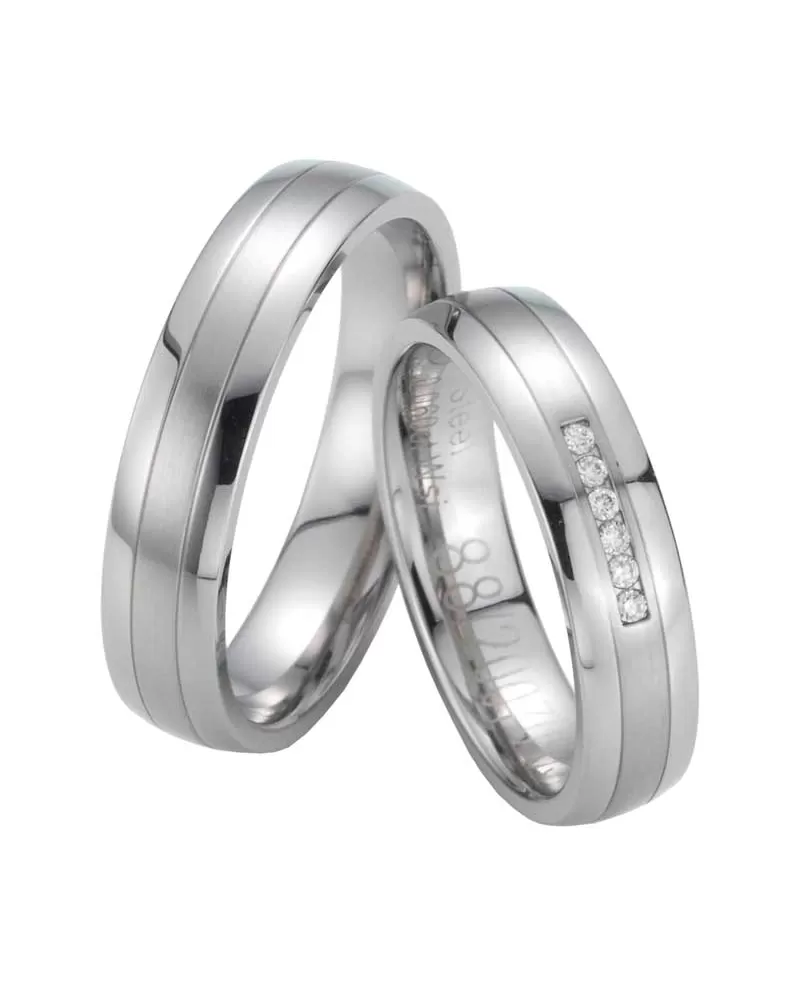 Veľmi pekné snubné prstene obľúbeného dizajnu z chirurgickej ocele v mierne polguľatom profile s kombinovanou povrchovou úpravou zamatový mat – lesk, kedy prostredný zamatovo matný prúžok je zvýraznený jemnými ryhami. V dámskom prsteni je vsadených šesť okrúhlych diamantov briliantového výbrusu. Diamanty vynikajú svojou krásou a vlastnosťami, ktoré sú oproti iným kameňom bezkonkurenčné. Je to najtvrdší nerast, ktorý nikdy nestratí svoju hodnotu. Diamant je kráľ všetkých drahokamov a teda aj jedným z najcennejších a preto sa oplatí do šperkov s diamantmi investovať a predovšetkým pri snubných prsteňoch, ktoré sú na celý život! Vsadzovanie diamantov vykonávajú naši najskúsenejší majstri zlatníci ručne pod mikroskopom s presnosťou na 0,01 mm a preto nehrozí vypadnutie kamienkov ako to býva u strojne vyrábaných snubných prsteňov. Snubné prstene majú vnútorný fit profil - zaoblenie vnútornej strany prsteňov pre príjemnejšie nosenie, nasadzovanie a odnímanie prsteňov.