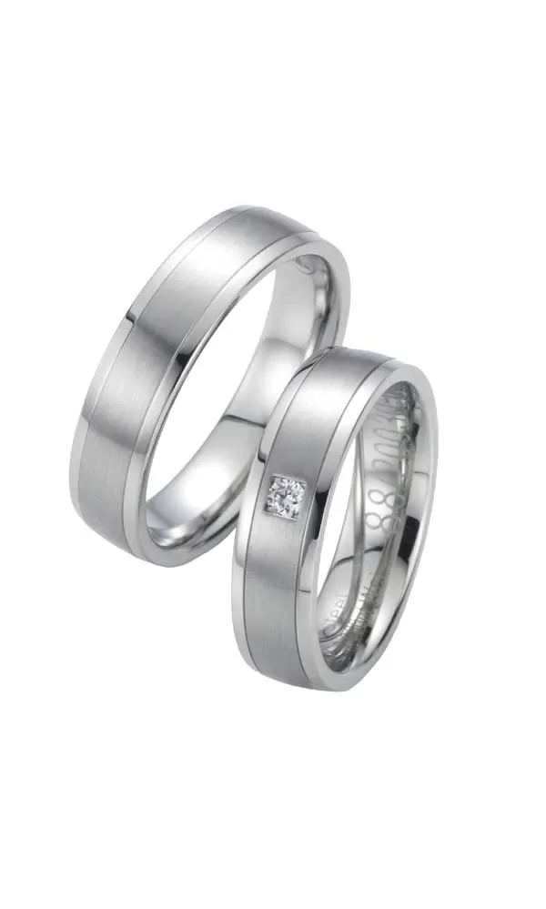 Elegantné snubné prstene z chirurgickej ocele v mierne polguľatom profile s kombinovanou povrchovou úpravou zamatový mat – lesk, kedy prostredný zamatovo matný prúžok je zvýraznený jemnými ryhami. V dámskom prsteni je vsadený jeden okrúhly diamant briliantového výbrusu do štvorčeka. Diamanty vynikajú svojou krásou a vlastnosťami, ktoré sú oproti iným kameňom bezkonkurenčné. Je to najtvrdší nerast, ktorý nikdy nestratí svoju hodnotu. Diamant je kráľ všetkých drahokamov a teda aj jedným z najcennejších a preto sa oplatí do šperkov s diamantmi investovať a predovšetkým pri snubných prsteňoch, ktoré sú na celý život!  Vsadzovanie diamantov vykonávajú naši najskúsenejší majstri zlatníci ručne pod mikroskopom s presnosťou na 0,01 mm a preto nehrozí vypadnutie kamienkov ako to býva u strojne vyrábaných snubných prsteňov. Snubné prstene majú vnútorný fit profil - zaoblenie vnútornej strany prsteňov pre príjemnejšie nosenie, nasadzovanie a odnímanie prsteňov.