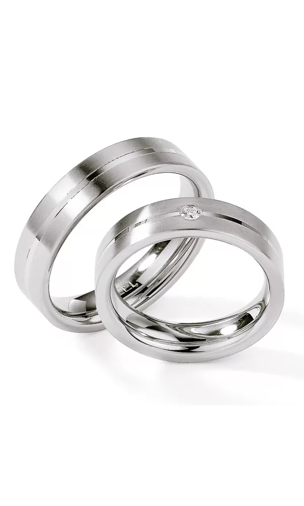Snubné prstene s diamantmi – vyrobené z chirurgickej ocele rovného profilu s matnou povrchovou úpravou as lesklým prúžkom uprostred. V dámskom snubnom prsteni je vsadený jeden okrúhly diamant briliantového brusu. Diamanty vynikajú svojou krásou a vlastnosťami, ktoré sú oproti iným kameňom bezkonkurenčné. Je to najtvrdší nerast, ktorý nikdy nestratí svoju hodnotu. Diamant je kráľ všetkých drahokamov a teda aj jedným z najcennejších a preto sa oplatí do šperkov s diamantmi investovať a predovšetkým pri snubných prsteňoch, ktoré sú na celý život! Vsadzovanie diamantov vykonávajú naši najskúsenejší majstri zlatníci ručne pod mikroskopom s presnosťou na 0,01 mm a preto nehrozí vypadnutie kamienkov ako to býva u strojne vyrábaných snubných prsteňov. Snubné prstene majú vnútorný fit profil - zaoblenie vnútornej strany prsteňov pre príjemnejšie nosenie, nasadzovanie a odnímanie prsteňov.