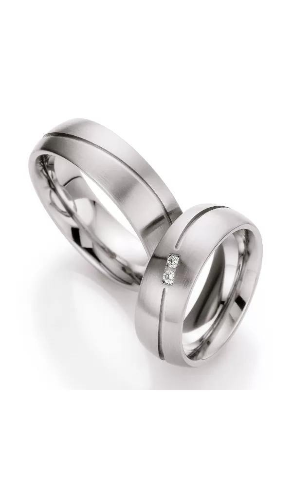 Široké snubné prstene z chirurgickej ocele polguľatého profilu s dvoma okrúhlymi diamantmi briliantového brusu v dámskom prsteni. Diamanty vynikajú svojou krásou a vlastnosťami, ktoré sú oproti iným kameňom bezkonkurenčné. Je to najtvrdší nerast, ktorý nikdy nestratí svoju hodnotu. Diamant je kráľ všetkých drahokamov a teda aj jedným z najcennejších a preto sa oplatí do šperkov s diamantmi investovať a predovšetkým pri snubných prsteňoch, ktoré sú na celý život! Vsadzovanie diamantov vykonávajú naši najskúsenejší majstri zlatníci ručne pod mikroskopom s presnosťou na 0,01 mm a preto nehrozí vypadnutie kamienkov ako to býva u strojne vyrábaných snubných prsteňov. Snubné prstene majú vnútorný fit profil - zaoblenie vnútornej strany prsteňov pre príjemnejšie nosenie, nasadzovanie a odnímanie prsteňov.