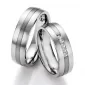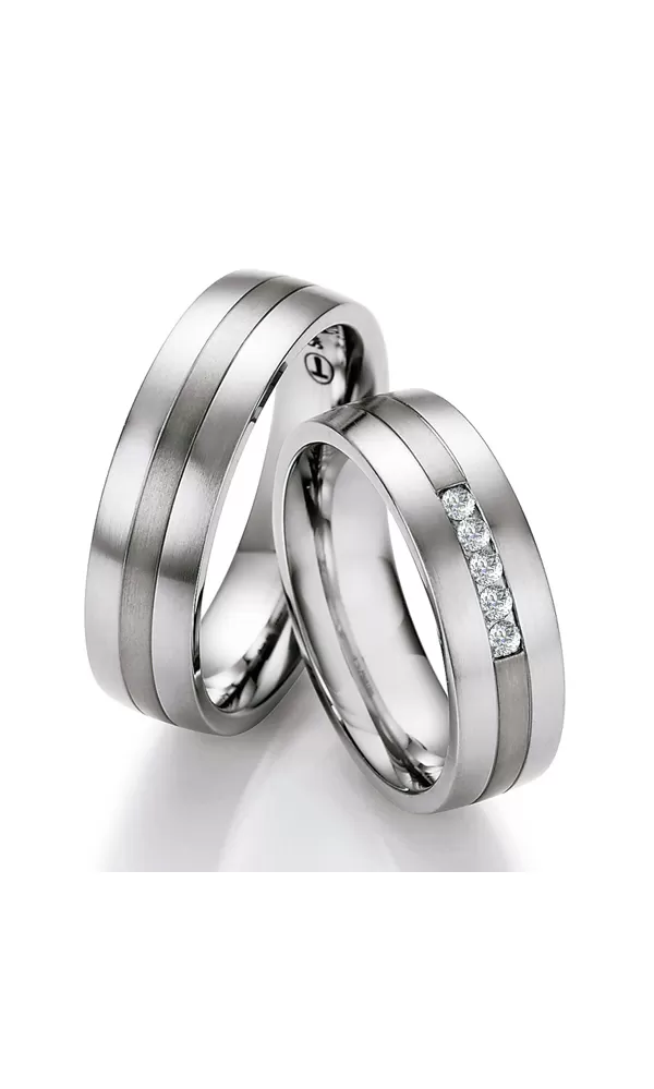 Oceľové snubné prstene kombinované s titánom, kedy do snubného prsteňa z chirurgickej ocele je vložený titánový prúžok. V dámskom prsteni je vsadených päť okrúhlych diamantov briliantového brusu. Snubné prstene sú vyrobené v rovnom profile s vnútorným fit profilom – zaoblenie vnútorných stien prsteňov. Snubné prstene sú v matnej povrchovej úprave - zamatový mat, kedy titánový prúžok je zvýraznený jemnými ryhami. Diamanty vynikajú svojou krásou a vlastnosťami, ktoré sú oproti iným kameňom bezkonkurenčné. Je to najtvrdší nerast, ktorý nikdy nestratí svoju hodnotu. Diamant je kráľ všetkých drahokamov a teda aj jedným z najcennejších a preto sa oplatí do šperkov s diamantmi investovať a predovšetkým pri snubných prsteňoch, ktoré sú na celý život! Vsadzovanie diamantov vykonávajú naši najskúsenejší majstri zlatníci ručne pod mikroskopom s presnosťou na 0,01 mm a preto nehrozí vypadnutie kamienkov ako to býva u strojne vyrábaných snubných prsteňov. Snubné prstene majú vnútorný fit profil - zaoblenie vnútornej strany prsteňov pre príjemnejšie nosenie, nasadzovanie a odnímanie prsteňov.