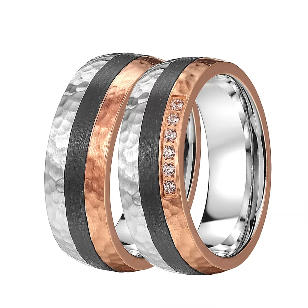Oceľové snubné prstene s karbónom, sú vyrobené v polguľatom profile av matnej povrchovej úprave. Prsteň je tvorený tromi časťami. Krajné pruhy sú z ocele a PVD ružovo pozlátenej ocele a prostredné je z karbónu. Prednosťou PVD zlatenia je vysoká tvrdosť a odolnosť proti oteru. Ide o hrubú vrstvu, ktorá preniká do pôvodného materiálu. PVD sa dá porovnať s približne s 12 mikrónmi galvanického zlatenia, čo je vysoká kvalita, ktorá pri bežnom nosení vydrží až 12 rokov. V dámskom prsteni je vsadených šesť okrúhlych zirkónov s briliantovým brusom Signity star, ktorý dodáva zirkónom maximálnu brilanciu. Prstene majú vnútorný fit profil - zaoblenú vnútornú stranu pre príjemnejšie nosenie, nasadzovanie a odnímanie.