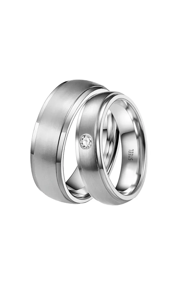 Snubné prstene z chirurgickej ocele v mierne polguľatom profile s kombinovanou povrchovou úpravou zamatový mat – lesk.  V dámskom prsteni je vsadený jeden okrúhly zirkón s briliantovým brusom Signity star, ktorý dodáva zirkónom maximálnu brilanciu. Prstene majú vnútorný fit profil - zaoblenú vnútornú stranu pre príjemnejšie nosenie, nasadzovanie a odnímanie.