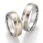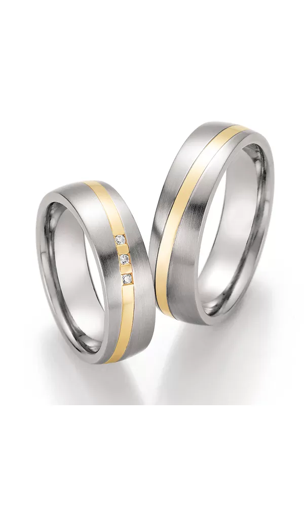 Elegantné snubné prstene z chirurgickej ocele v kombinácii so zlatom 585/1000 majú mierne polguľatý profil s kombinovanou povrchovou úpravou zamatový mat – lesk. Kedy zlatý prúžok uprostred je lesklý. V dámskom prsteni sú vsadené tri okrúhle diamanty briliantového výbrusu. Prstene majú vnútorný fit profil - zaoblenie vnútorných hrán pre príjemnejšie nosenie. Diamanty vynikajú svojou krásou a vlastnosťami, ktoré sú oproti iným kameňom bezkonkurenčné. Je to najtvrdší nerast, ktorý nikdy nestratí svoju hodnotu. Diamant je kráľ všetkých drahokamov a teda aj jedným z najcennejších a preto sa oplatí do šperkov s diamantmi investovať a predovšetkým pri snubných prsteňoch, ktoré sú na celý život! Vsadzovanie diamantov vykonávajú naši najskúsenejší majstri zlatníci ručne pod mikroskopom s presnosťou na 0,01 mm a preto nehrozí vypadnutie kamienkov ako to býva u strojne vyrábaných snubných prsteňov. Snubné prstene majú vnútorný fit profil - zaoblenie vnútornej strany prsteňov pre príjemnejšie nosenie, nasadzovanie a odnímanie prsteňov.