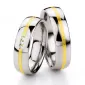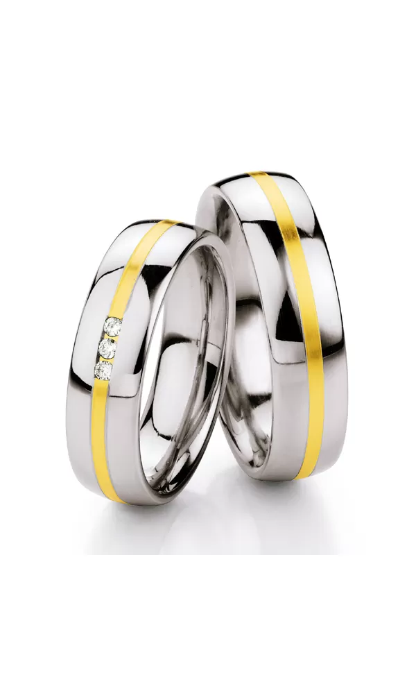 Oceľové snubné prstene v kombinácii so zlatom 585/1000 = 14 karátov v pologuľatom profile s kombinovanou povrchovou úpravou, kde chirurgická oceľ je lesklá so zamatovo matným zlatým prúžkom, ktorý je oddelený jemnými. V dámskom prsteni sú vsadené tri okrúhle diamanty briliantového brusu. Snubné prstene majú vnútorný fit profil - zaoblenie vnútornej strany prsteňov. Diamanty vynikajú svojou krásou a vlastnosťami, ktoré sú oproti iným kameňom bezkonkurenčné. Je to najtvrdší nerast, ktorý nikdy nestratí svoju hodnotu. Diamant je kráľ všetkých drahokamov a teda aj jedným z najcennejších a preto sa oplatí do šperkov s diamantmi investovať a predovšetkým pri snubných prsteňoch, ktoré sú na celý život! Vsadzovanie diamantov vykonávajú naši najskúsenejší majstri zlatníci ručne pod mikroskopom s presnosťou na 0,01 mm a preto nehrozí vypadnutie kamienkov ako to býva u strojne vyrábaných snubných prsteňov. Snubné prstene majú vnútorný fit profil - zaoblenie vnútornej strany prsteňov pre príjemnejšie nosenie, nasadzovanie a odnímanie prsteňov.