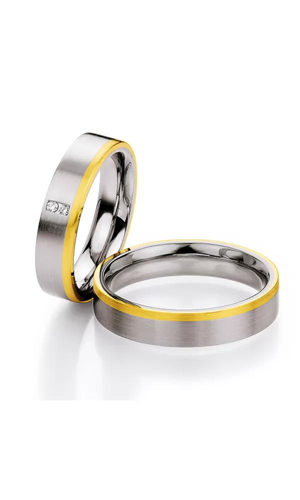 Snubné prstene z chirurgickej ocele v kombinácii so žltým zlatom 585/1000 = 14 karátov rovného profilu s matnou povrchovou úpravou. V dámskom prsteni je vsadený jeden okrúhly diamant briliantového brusu. Snubné prstene majú vnútorný fit profil - zaoblenie vnútornej strany prsteňov. Diamanty vynikajú svojou krásou a vlastnosťami, ktoré sú oproti iným kameňom bezkonkurenčné. Je to najtvrdší nerast, ktorý nikdy nestratí svoju hodnotu. Diamant je kráľ všetkých drahokamov a teda aj jedným z najcennejších a preto sa oplatí do šperkov s diamantmi investovať a predovšetkým pri snubných prsteňoch, ktoré sú na celý život! Vsadzovanie diamantov vykonávajú naši najskúsenejší majstri zlatníci ručne pod mikroskopom s presnosťou na 0,01 mm a preto nehrozí vypadnutie kamienkov ako to býva u strojne vyrábaných snubných prsteňov. Snubné prstene majú vnútorný fit profil - zaoblenie vnútornej strany prsteňov pre príjemnejšie nosenie, nasadzovanie a odnímanie prsteňov.