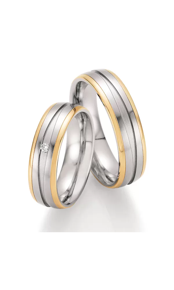 Elegantné snubné prstene z chirurgickej ocele v kombinácii so zlatom 585/1000 majú mierne polguľatý profil s kombinovanou povrchovou úpravou zamatový mat – lesk. Kedy zlaté prúžky na kraji sú lesklé a uprostred prsteňa je matná ryha. V dámskom prsteni je vsadený jeden okrúhly diamant briliantového výbrusu. Prstene majú vnútorný fit profil - zaoblenie vnútorných hrán pre príjemnejšie nosenie. Diamanty vynikajú svojou krásou a vlastnosťami, ktoré sú oproti iným kameňom bezkonkurenčné. Je to najtvrdší nerast, ktorý nikdy nestratí svoju hodnotu. Diamant je kráľ všetkých drahokamov a teda aj jedným z najcennejších a preto sa oplatí do šperkov s diamantmi investovať a predovšetkým pri snubných prsteňoch, ktoré sú na celý život! Vsadzovanie diamantov vykonávajú naši najskúsenejší majstri zlatníci ručne pod mikroskopom s presnosťou na 0,01 mm a preto nehrozí vypadnutie kamienkov ako to býva u strojne vyrábaných snubných prsteňov. Snubné prstene majú vnútorný fit profil - zaoblenie vnútornej strany prsteňov pre príjemnejšie nosenie, nasadzovanie a odnímanie prsteňov.