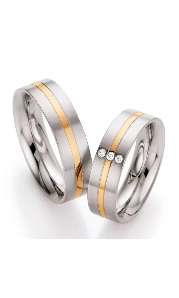 Snubné prstene z chirurgickej ocele v kombinácii s ružovým zlatom 585/1000 = 14 karátov v pologuľatom profile s kombinovanou povrchovou úpravou - oceľová časť zamatovo matná, ružové zlato lesklé. V dámskom prsteni sú vsadené tri okrúhle diamanty briliantového brusu. Snubné prstene majú vnútorný fit profil - zaoblenie vnútornej strany prsteňov. Diamanty vynikajú svojou krásou a vlastnosťami, ktoré sú oproti iným kameňom bezkonkurenčné. Je to najtvrdší nerast, ktorý nikdy nestratí svoju hodnotu. Diamant je kráľ všetkých drahokamov a teda aj jedným z najcennejších a preto sa oplatí do šperkov s diamantmi investovať a predovšetkým pri snubných prsteňoch, ktoré sú na celý život! Vsadzovanie diamantov vykonávajú naši najskúsenejší majstri zlatníci ručne pod mikroskopom s presnosťou na 0,01 mm a preto nehrozí vypadnutie kamienkov ako to býva u strojne vyrábaných snubných prsteňov. Snubné prstene majú vnútorný fit profil - zaoblenie vnútornej strany prsteňov pre príjemnejšie nosenie, nasadzovanie a odnímanie prsteňov.