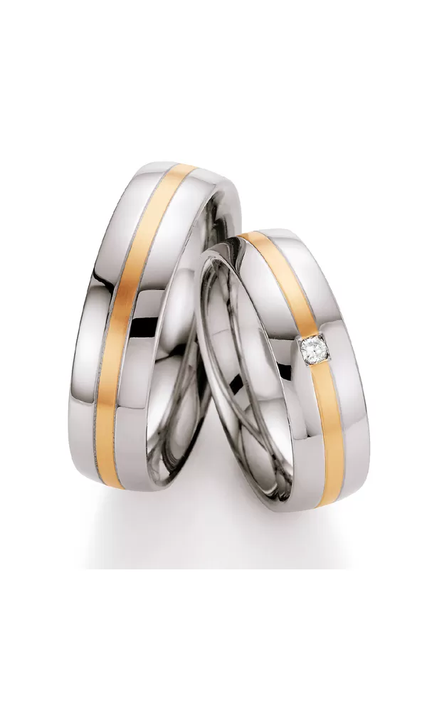 Snubné prstene z chirurgickej ocele v kombinácii s ružovým zlatom 585/1000 = 14 karátov v pologuľatom profile v kombinovanej povrchovej úprave - oceľ lesklá, ružové zlato zamatovo matné. V dámskom prsteni je vsadený jeden okrúhly diamant briliantového brusu. Snubné prstene majú vnútorný fit profil - zaoblenie vnútornej strany prsteňov. Diamanty vynikajú svojou krásou a vlastnosťami, ktoré sú oproti iným kameňom bezkonkurenčné. Je to najtvrdší nerast, ktorý nikdy nestratí svoju hodnotu. Diamant je kráľ všetkých drahokamov a teda aj jedným z najcennejších a preto sa oplatí do šperkov s diamantmi investovať a predovšetkým pri snubných prsteňoch, ktoré sú na celý život! Vsadzovanie diamantov vykonávajú naši najskúsenejší majstri zlatníci ručne pod mikroskopom s presnosťou na 0,01 mm a preto nehrozí vypadnutie kamienkov ako to býva u strojne vyrábaných snubných prsteňov. Snubné prstene majú vnútorný fit profil - zaoblenie vnútornej strany prsteňov pre príjemnejšie nosenie, nasadzovanie a odnímanie prsteňov.
