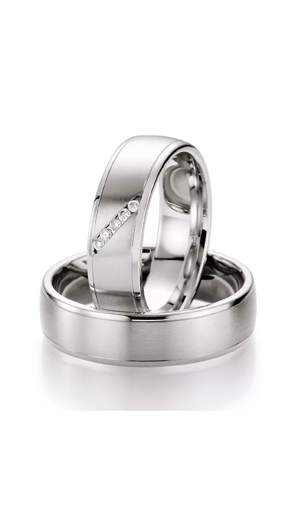 Snubné prstene biele zlato - vyrobené zo štrnásťkarátového bieleho zlata - 585/000 v mierne polguľatom profile v matnej povrchovej úprave s lesklými prúžkami na krajoch oddelené jemnými ryhami. V dámskom prsteni je vsadených päť okrúhlych diamantov briliantového brusu. Diamanty oplývajú svojou krásou a vlastnosťami, ktoré sú oproti iným kameňom bezkonkurenčné. Je to najtvrdší nerast, ktorý nikdy nestratí svoju hodnotu. Diamant je kráľ všetkých drahokamov a teda aj jedným z najcennejších a preto sa oplatí do šperkov s diamantmi investovať a predovšetkým pri snubných prsteňoch, ktoré sú na celý život! Vsadzovanie diamantov vykonávajú naši najskúsenejší majstri zlatníci ručne pod mikroskopom s presnosťou na 0,01 mm a preto nehrozí vypadnutie kamienkov ako to býva u strojne vyrábaných snubných prsteňov. Snubné prstene majú vnútorný fit profil - zaoblenie vnútornej strany prsteňov pre príjemnejšie nosenie.