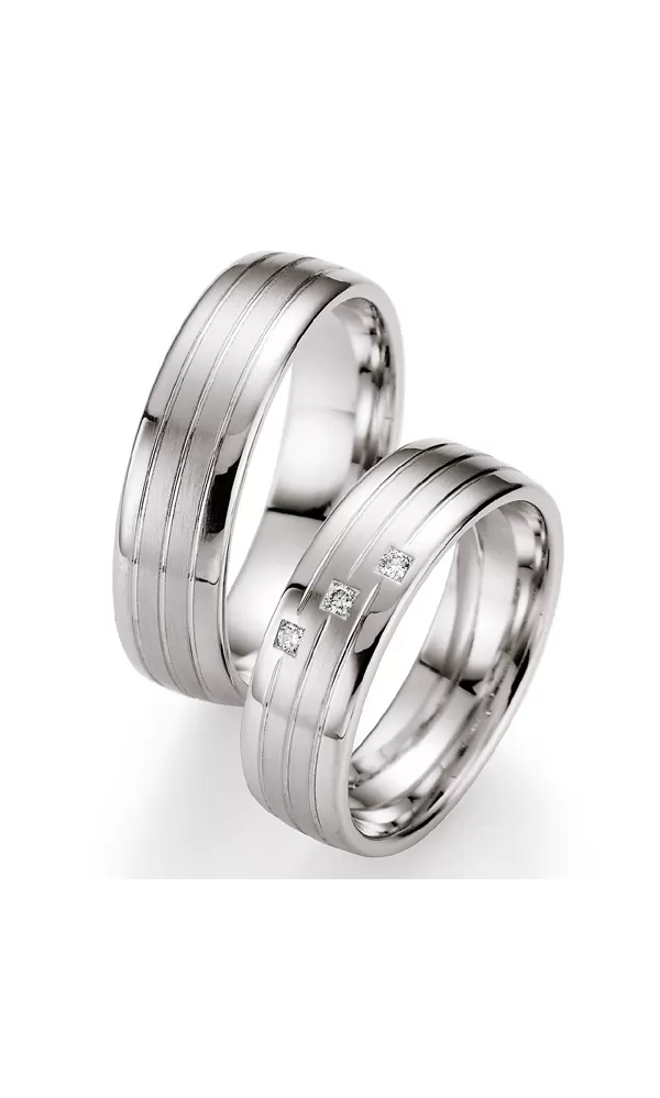 Snubné prstene biele zlato vyrobené z štrnásťkarátového bieleho zlata - 585/000 vo veľmi miernom polguľatom profile v kombinovanej povrchovej úprave lesk - zamatový mat s tromi lesklými ryhami. V dámskom prsteni sú vsadené do štvorčekov tri okrúhle diamanty briliantového brusu. Diamanty oplývajú svojou krásou a vlastnosťami, ktoré sú oproti iným kameňom bezkonkurenčné. Je to najtvrdší nerast, ktorý nikdy nestratí svoju hodnotu. Diamant je kráľ všetkých drahokamov a teda aj jedným z najcennejších a preto sa oplatí do šperkov s diamantmi investovať a predovšetkým pri snubných prsteňoch, ktoré sú na celý život! Vsadzovanie diamantov vykonávajú naši najskúsenejší majstri zlatníci ručne pod mikroskopom s presnosťou na 0,01 mm a preto nehrozí vypadnutie kamienkov ako to býva u strojne vyrábaných snubných prsteňov. Snubné prstene majú vnútorný fit profil - zaoblenie vnútornej strany prsteňov pre príjemnejšie nosenie.