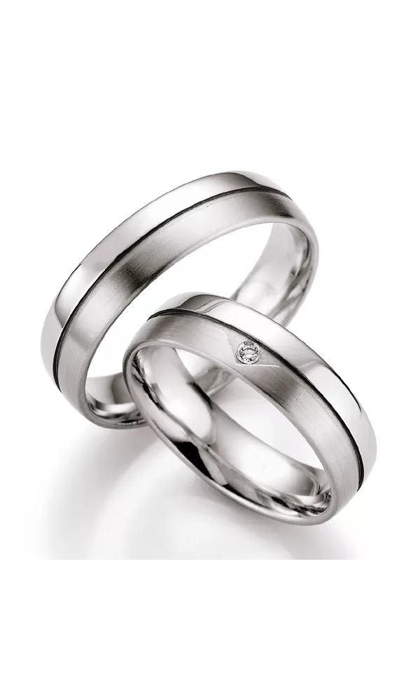 Snubné prstene biele zlato vyrobené zo štrnásťkarátového bieleho zlata - 585/000 v mierne polguľatom profile v kombinovanej povrchovej úprave lesk - zamatový mat. V dámskom prsteni je vsadený do trojuholníka jeden guľatý diamant briliantového brusu.  Diamanty oplývajú svojou krásou a vlastnosťami, ktoré sú oproti iným kameňom bezkonkurenčné. Je to najtvrdší nerast, ktorý nikdy nestratí svoju hodnotu. Diamant je kráľ všetkých drahokamov a teda aj jedným z najcennejších a preto sa oplatí do šperkov s diamantmi investovať a predovšetkým pri snubných prsteňoch, ktoré sú na celý život! Vsadzovanie diamantov vykonávajú naši najskúsenejší majstri zlatníci ručne pod mikroskopom s presnosťou na 0,01 mm a preto nehrozí vypadnutie kamienkov ako to býva u strojne vyrábaných snubných prsteňov. Snubné prstene majú vnútorný fit profil - zaoblenie vnútornej strany prsteňov pre príjemnejšie nosenie.