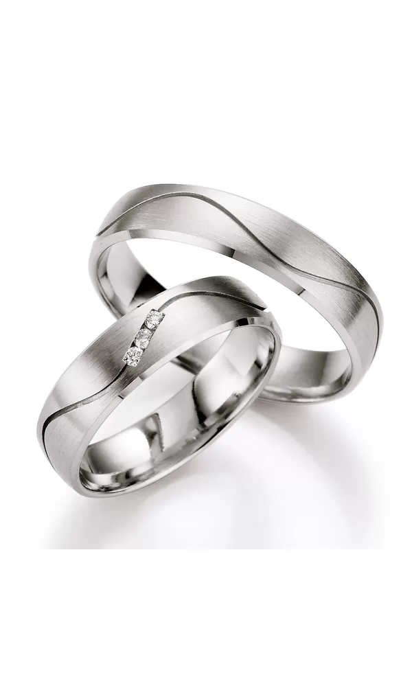 Snubné prstene biele zlato štrnásť karátov - 585/000 v pologuľatom profile v matnej povrchovej úprave s vlnovkou. V dámskom prsteni sú vsadené tri okrúhle diamanty briliantového brusu. Diamanty oplývajú svojou krásou a vlastnosťami, ktoré sú oproti iným kameňom bezkonkurenčné. Je to najtvrdší nerast, ktorý nikdy nestratí svoju hodnotu. Diamant je kráľ všetkých drahokamov a teda aj jedným z najcennejších a preto sa oplatí do šperkov s diamantmi investovať a predovšetkým pri snubných prsteňoch, ktoré sú na celý život! Vsadzovanie diamantov vykonávajú naši najskúsenejší majstri zlatníci ručne pod mikroskopom s presnosťou na 0,01 mm a preto nehrozí vypadnutie kamienkov ako to býva u strojne vyrábaných snubných prsteňov. Snubné prstene majú vnútorný fit profil - zaoblenie vnútornej strany prsteňov pre príjemnejšie nosenie.