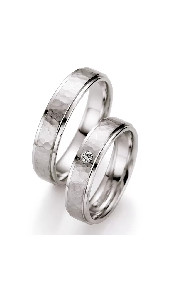 Zlaté snubné prstene vyrobené zo štrnásťkarátového bieleho zlata - 585/000 v rovnom profile v matnej povrchovej úprave s lesklými prúžkami na krajoch. V dámskom prsteni je vsadený jeden okrúhly diamant briliantového brusu. Diamanty oplývajú svojou krásou a vlastnosťami, ktoré sú oproti iným kameňom bezkonkurenčné. Je to najtvrdší nerast, ktorý nikdy nestratí svoju hodnotu. Diamant je kráľ všetkých drahokamov a teda aj jedným z najcennejších a preto sa oplatí do šperkov s diamantmi investovať a predovšetkým pri snubných prsteňoch, ktoré sú na celý život! Vsadzovanie diamantov vykonávajú naši najskúsenejší majstri zlatníci ručne pod mikroskopom s presnosťou na 0,01 mm a preto nehrozí vypadnutie kamienkov ako to býva u strojne vyrábaných snubných prsteňov. Snubné prstene majú vnútorný fit profil - zaoblenie vnútornej strany prsteňov pre príjemnejšie nosenie.