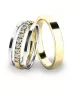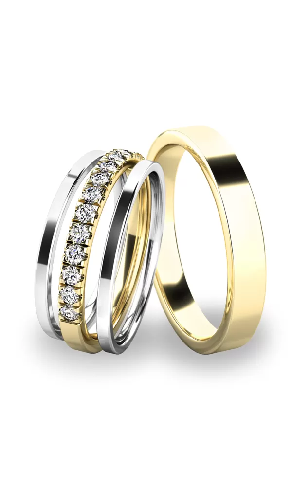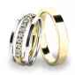 • Biele - žlté zlato: Dámsky prsteň so zirkónmi a pánsky prsteň je zo žltého zlata a postranné krúžky sú z bieleho zlata